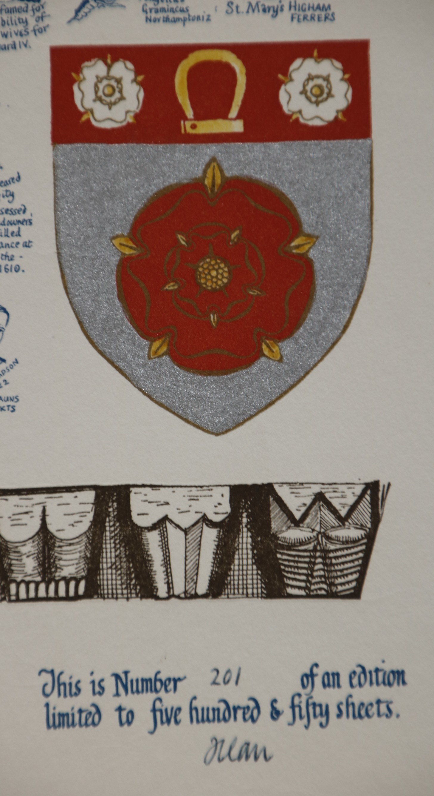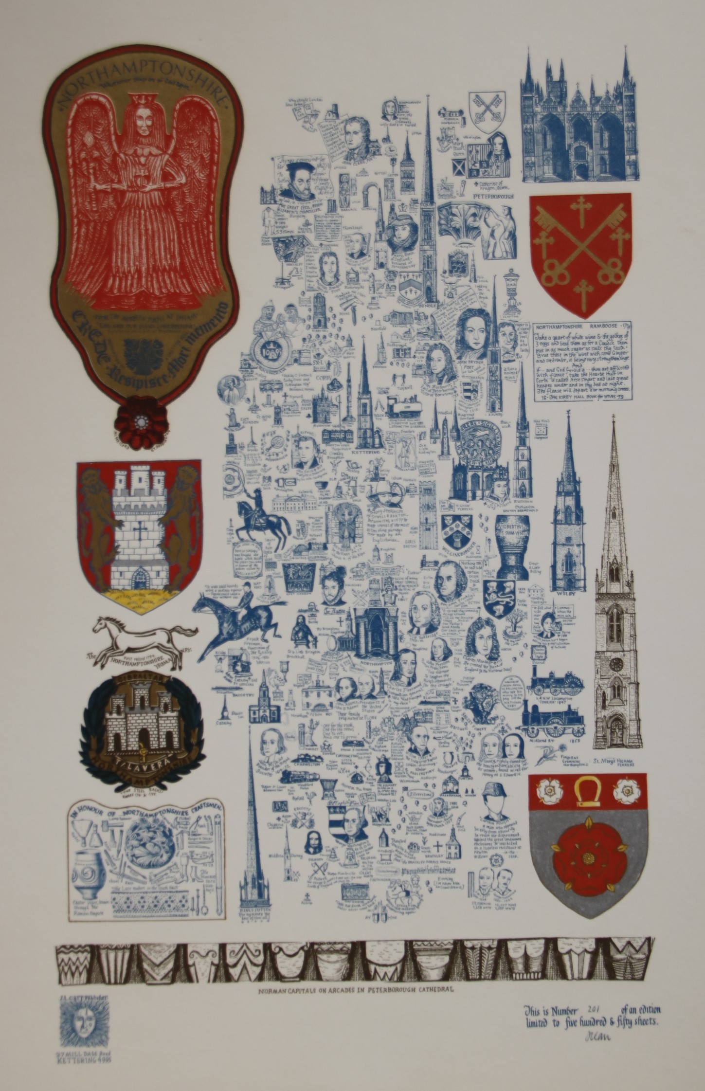 Notes: A few changes have been made to the design: the row of figures under the angel has been replaced with a shield, and the strip of drawings of carvings along the base has been replaced with Norman capitals on arcades at Peterborough Cathedral. The colophon and limitation are now separate at the bottom of the map.