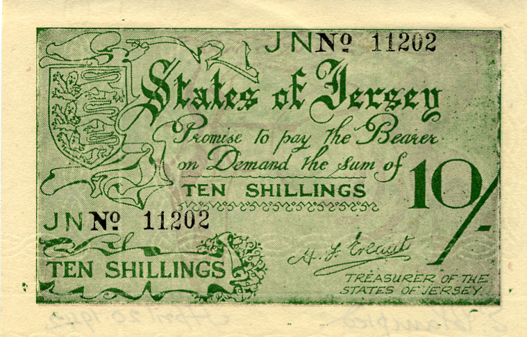 During the Second World War the Island of Jersey was occupied by the Germans. Islanders continued to use British currency but it gradually ran out as German soldiers kept the silver coins as souvenirs and the paper currency wore out. In late 1941 Edmund Blampied was asked to design bank notes for the Island in denominations of 6 pence (6d), 1 shilling (1/-), 2 shillings (2/-), 10 shillings (10/-) and 1 pound (£1). A second 2/- note, not designed by Blampied, was also issued. The printing blocks for the notes were made by the Jersey Evening Post and they were printed by Bigwoods Ltd. of Jersey.