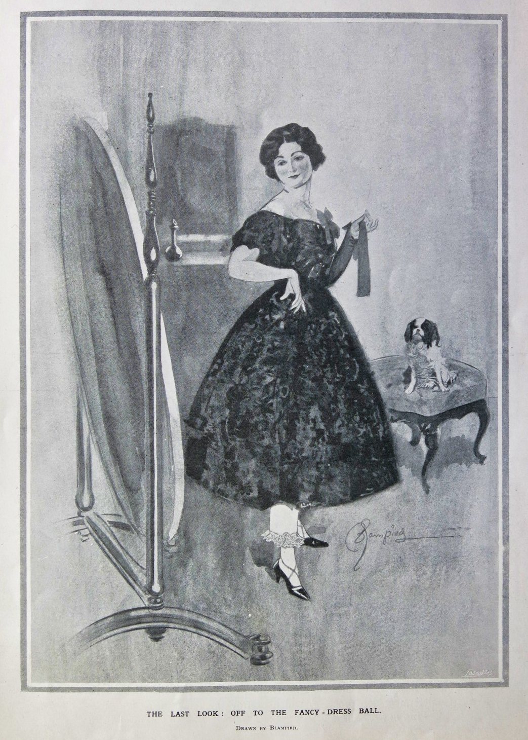 Issue: 11-Feb-1914, vol. 85, no. 1098,"The Sketch" Fancy-Dress Supplement, p 1. Type: MO1. Price: 1/-. Author: none. Title: The last look: off to the fancy-dress ball.