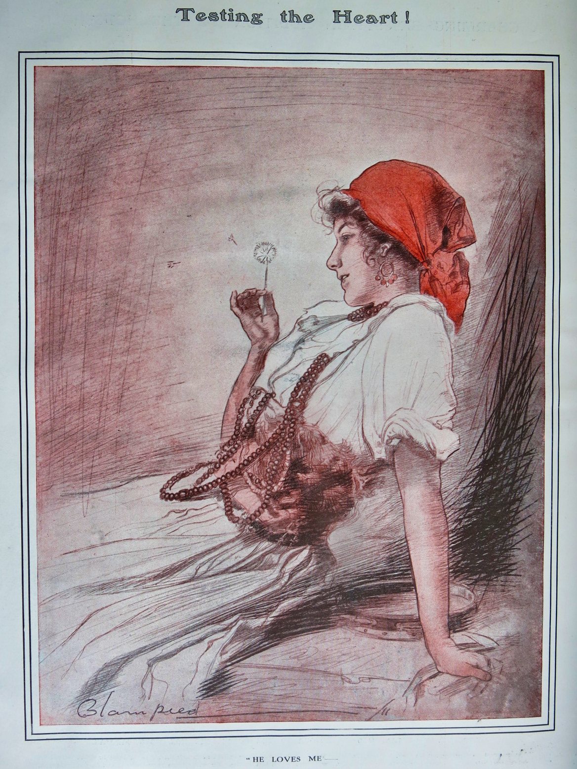 Issue: 22-Apr-1914, vol. 86, no. 1108, The Sketch Supplement, p 10. Type: CO1. Price: 6d. Author: none. Title: "Testing the heart . . . He loves me --".