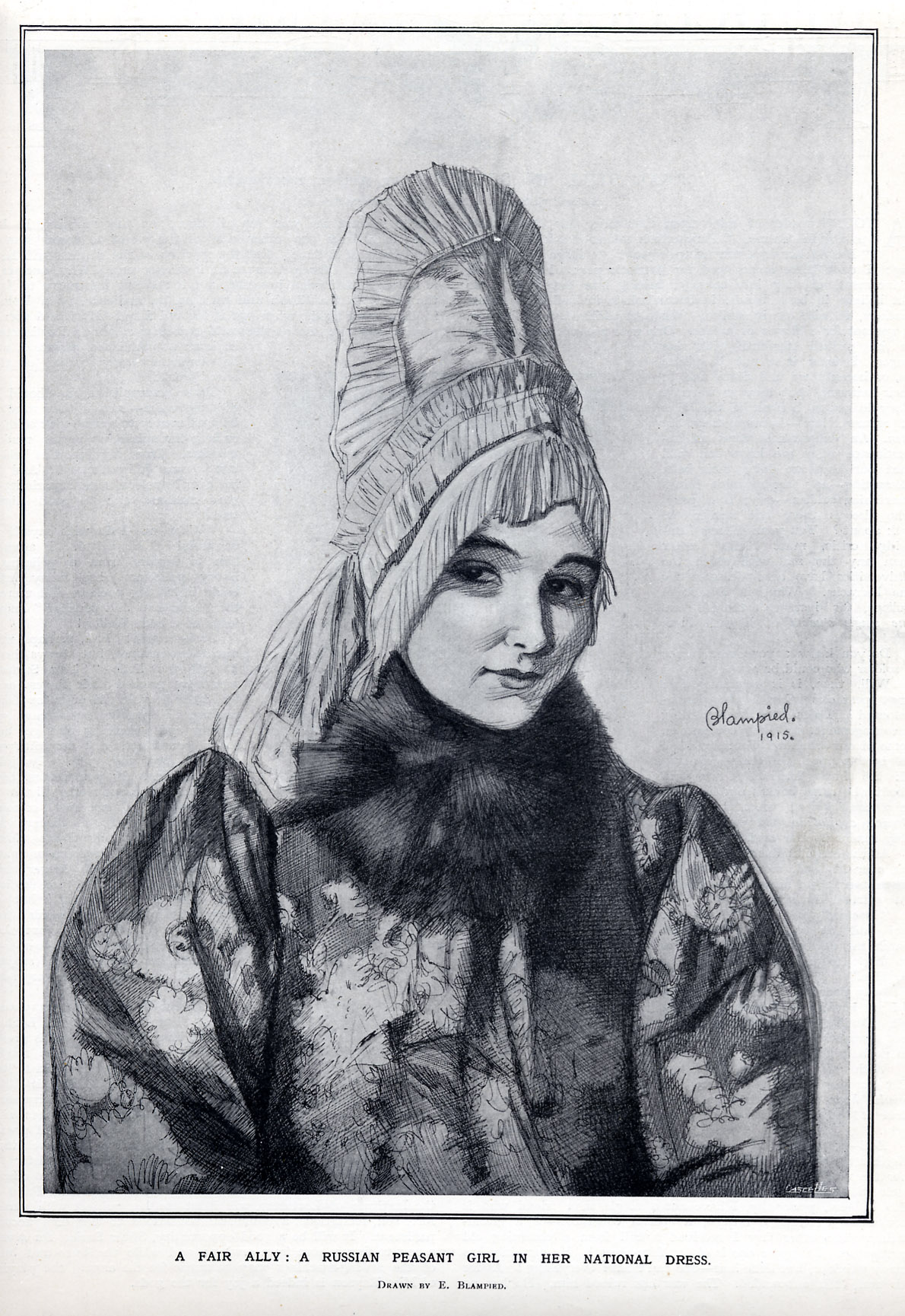 Issue: 3-Feb-1915, vol. 89, no. 1149, The Sketch Supplement, p 1. Type: MO1. Price: 6d. Author: none. Title: A fair ally: a Russian peasant girl in her national dress.