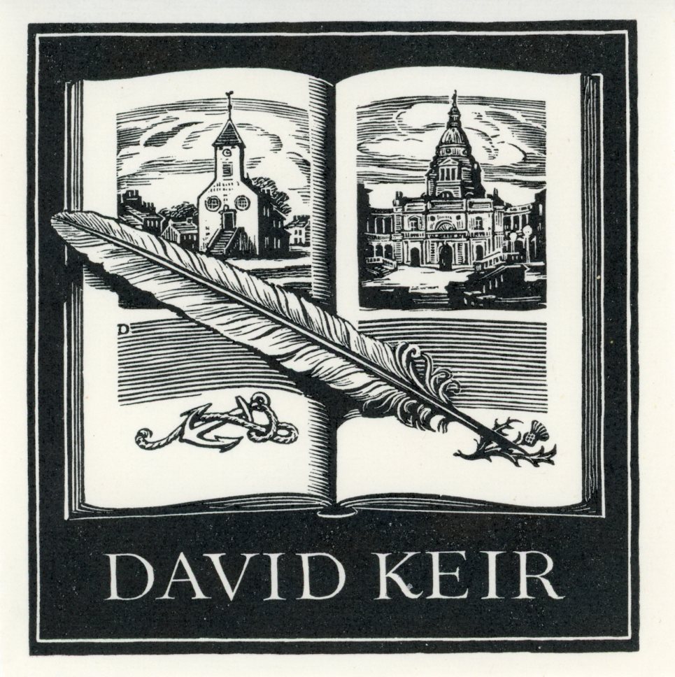 Notes: This bookplate was designed and engraved on wood by Joan Hassall (1906-1988) for David Keir (1895-1975), an Historian.