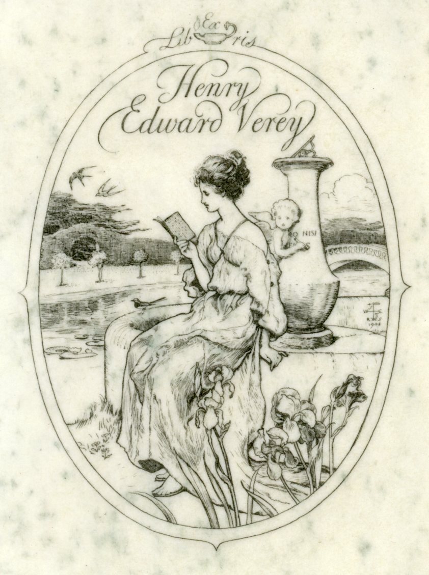 Notes: This bookplate was designed by Joseph Walter West (1860-1933), an artist in watercolours who designed posters for the London Underground. T He was Vice-President of the Royal Watercolour Society (RWS) for two years between 1918 and 1920.