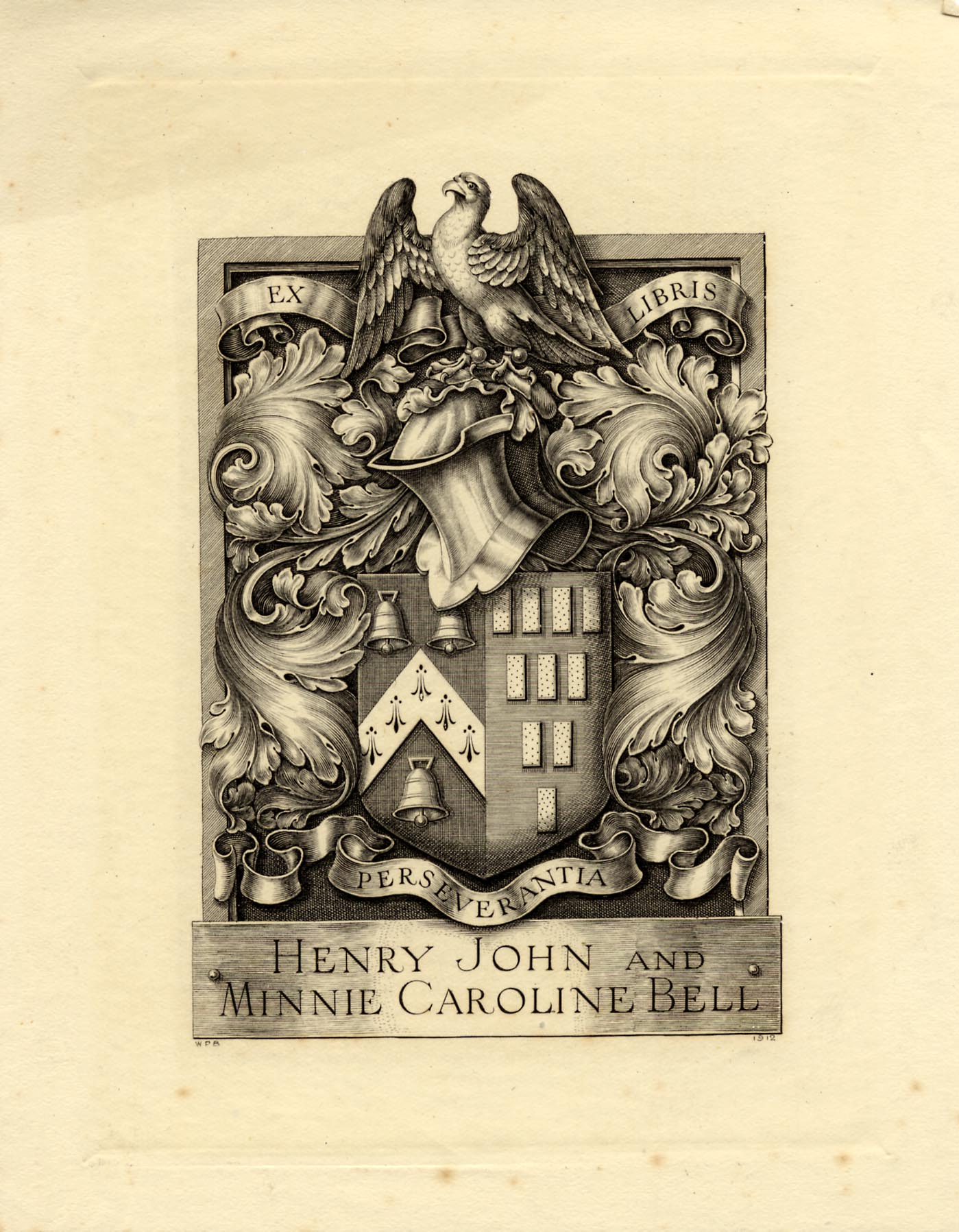 Henry and Minnie were book collectors, particularly of fine bindings, such as the Doves Bindery and the Kelmscott Press. Henry Bell made his money as a goldsmith and in 1914 was a director of Garrard & Co, Crown Jewellers. He may also have been Crown Jeweller, himself. They lived at Linden House, College Road, Epsom. According to Horace Jones (1978) the coat of arms is 'Bell impaling Blundell', meaning arms side by use, usually a husband and wife. The 10 rectangles are called 'billets', which may represent a block of wood or a sheet of paper. I can find no Minnie Caroline Blundell and the only reference to her is about the bookplate.