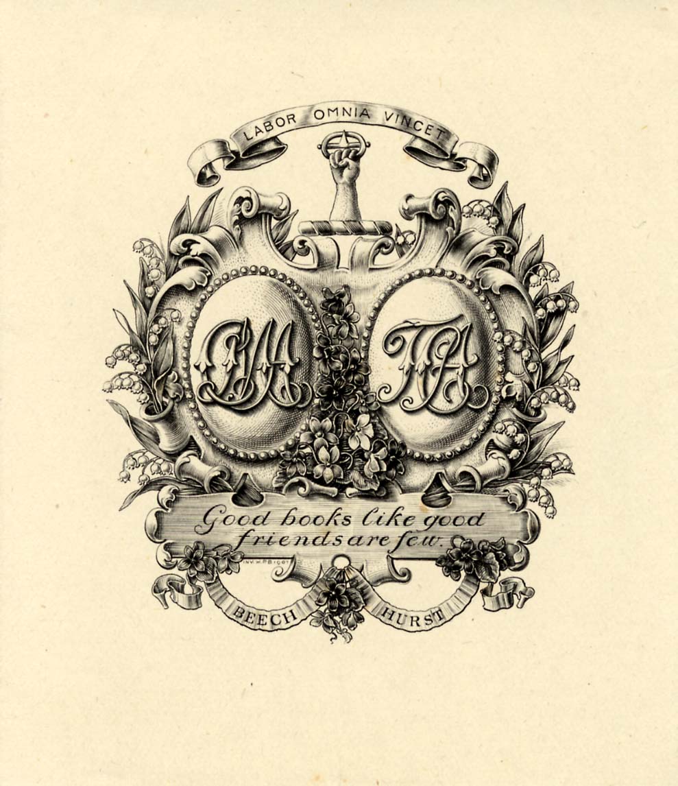 This is the bookplate of Thomas Chester Ansdell (1846-1926) and Constance Mary Ansdell (nee Agnew). Thomas was one of 11 children of the painter Richard Ansdell R.A. They were the parents of Beryl Constance Ansdell (1889-1961) and Thomas Agnew Ansdell (1891-1966), both of whom had WPB bookplates, all designed in 1907-08.