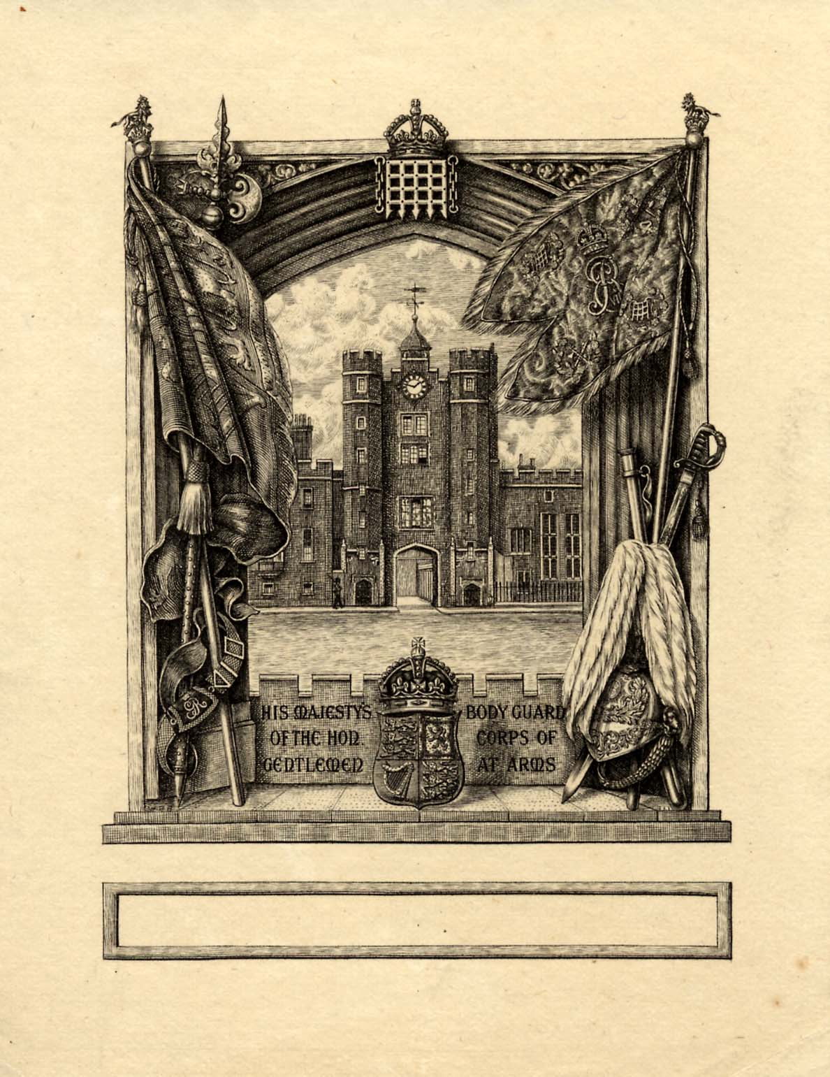 The Honorable Corps of the Gentlemen at Arms is a body guard to the British monarch. They last saw battle during the English civil war. Their uniform is of a Dragoon Guards officer of the 1840s. The building on the bookplate is St. James's Palace on Pall Mall in London. There are variants.
