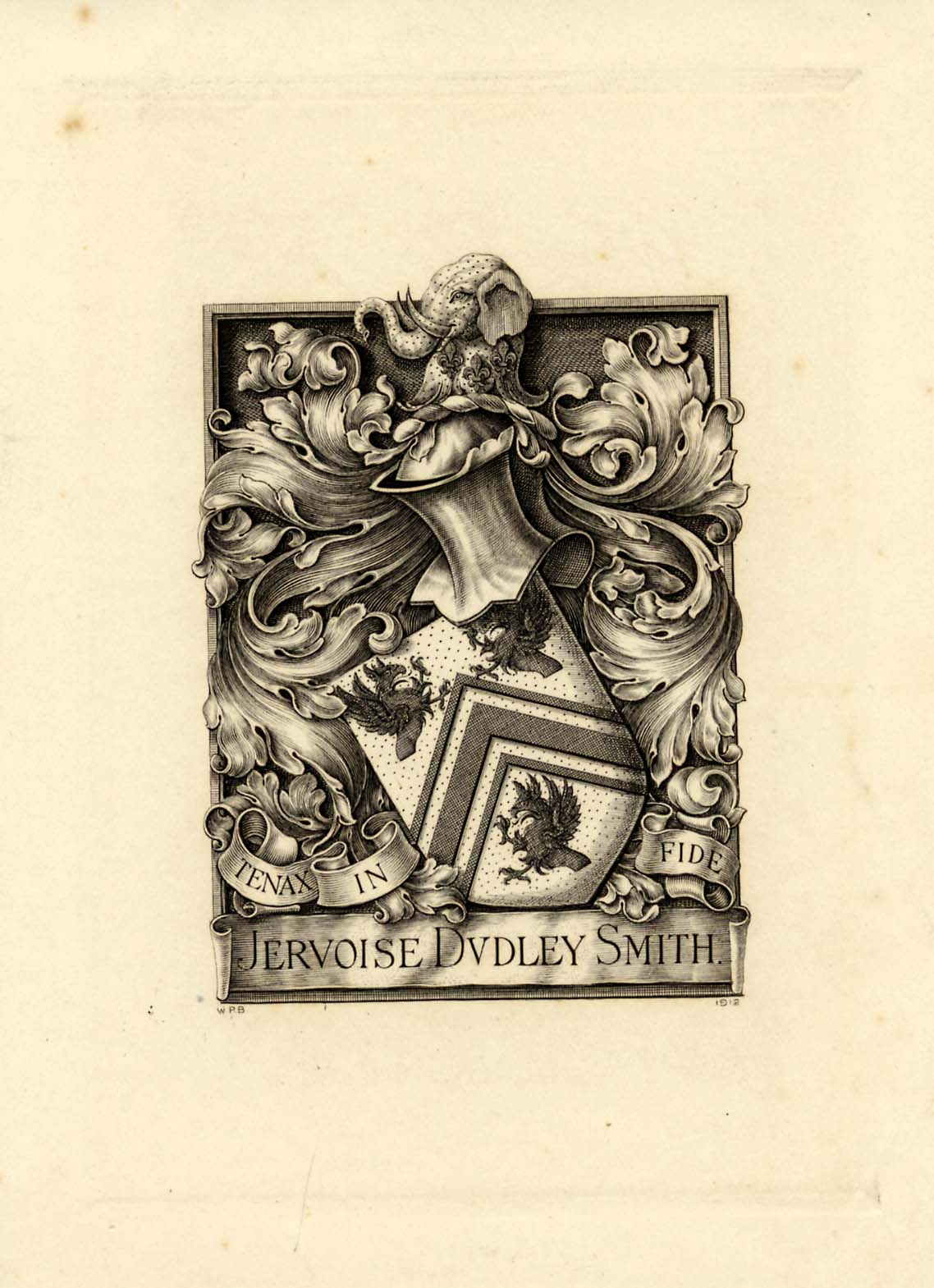 This bokplate is for Charles Jevoise Dudley Smith (1895-1915) who died aged 19 y during the First World War serving as 2nd Lieutenant in the Grenadier Guards. He was son of Gerald Dudley Smith and Lady Barbara Smith of Strensham Court, Worcester. He is commemorated on the Le Touret Memorial Panel 2, which means that his body was not recovered. He is also commemorated on a memorial in the cloisters at Eton College, his school, and at Strensham War Memorial in Worcestershire.