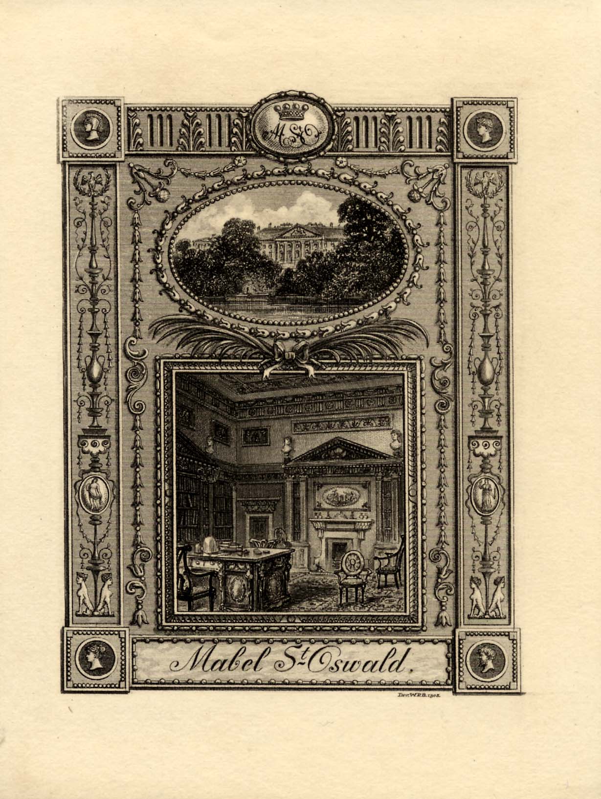 The house in the bookplate is Nostell Priory, now owned by the National Trust, where the Winn's family posessions are on display including Chippendale furniture that was made for the house. She had another bookplate designed for her in 1910.