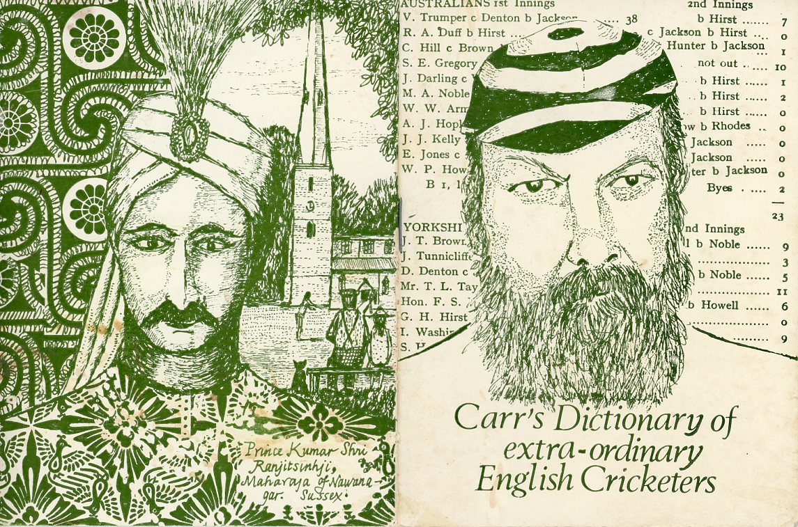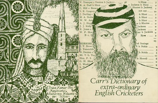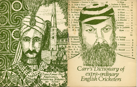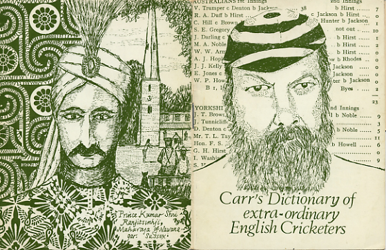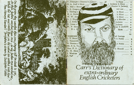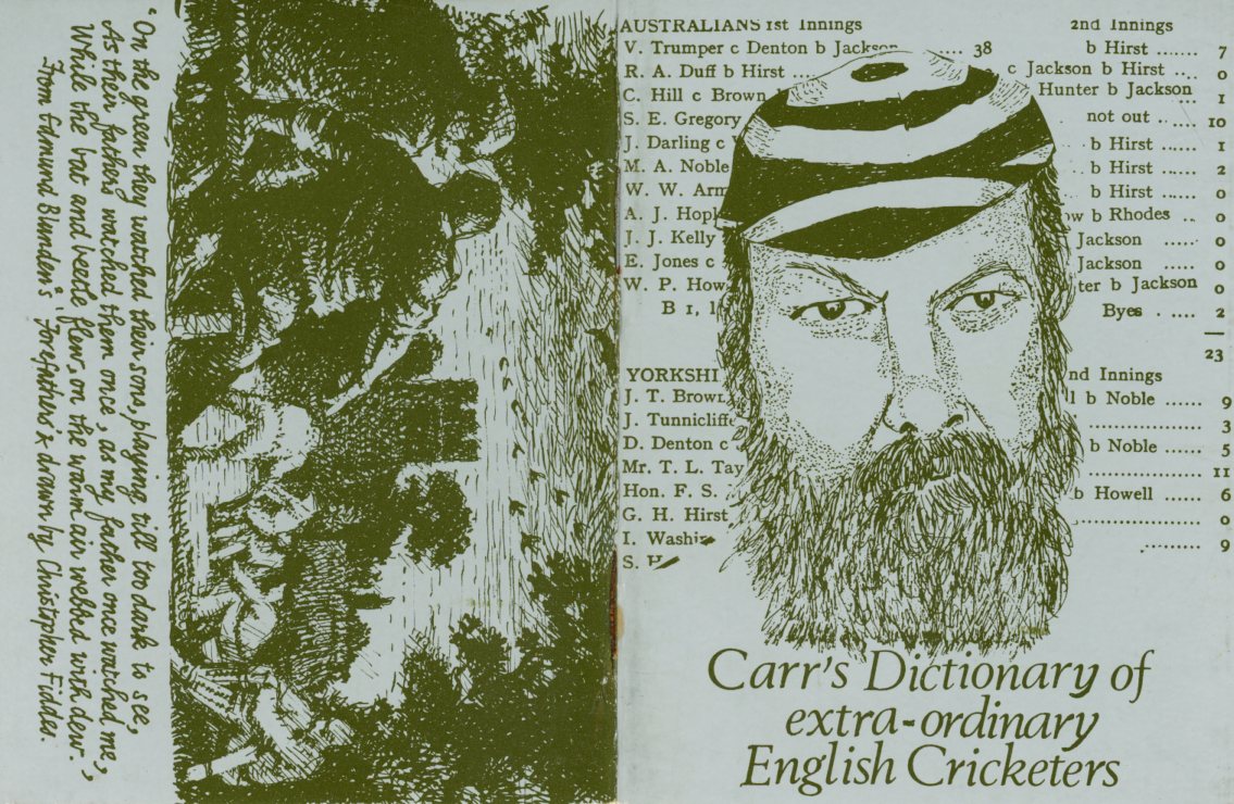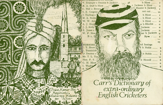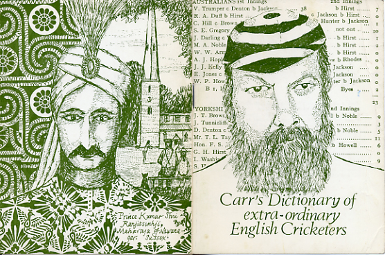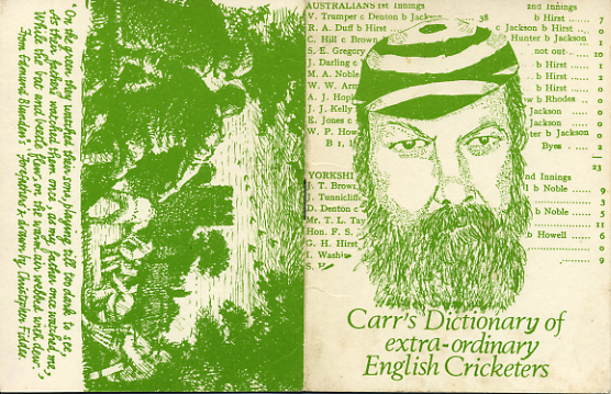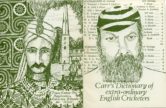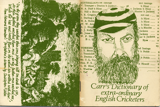 The cover shows behind the head of W.G. Grace part of the scorecard from the match on 2nd-3rd June, 1902 at Headingley in Leeds in which the Australians were dismissed by Yorkshire for only 23 runs in their second innings. Carr changed the person who took the wicket of A.J. Hopkins from ‘lbw Hirst’ to ‘lbw Rhodes’. Why? Perhaps because, otherwise, Wilfred Rhodes (1877-1973), who did not bowl in the second innings, would not have appeared in the scorecard illustrated on the Dictionary? Both the Honorable F.S.Jackson (1870-1947) and George Hirst (1871-1954) took 5 wickets each in Australia's second innings and Rhodes did not bowl. That innings lasted only 14 overs, the match ended in two days, and Yorkshire won by 5 wickets. Carr was born 10 years later. Both Hirst and Rhodes have entries in the dictionary. Carr wrote at the end of the entry on Rhodes: One can only marvel at a recently notorious list of peerages knowing that he never received one.