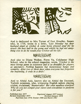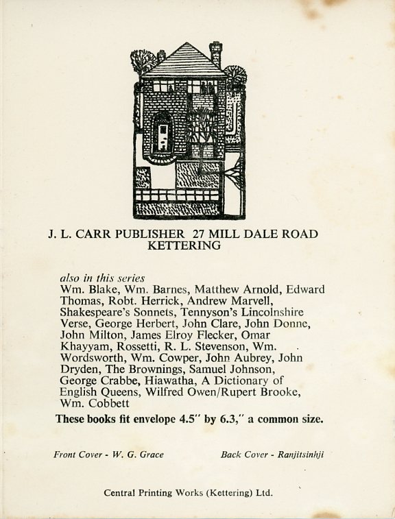 Cover artist: J.L. Carr - W.G. Grace on front; Christopher Fiddes on rear with poem by Edmund Blunden written out by Carr