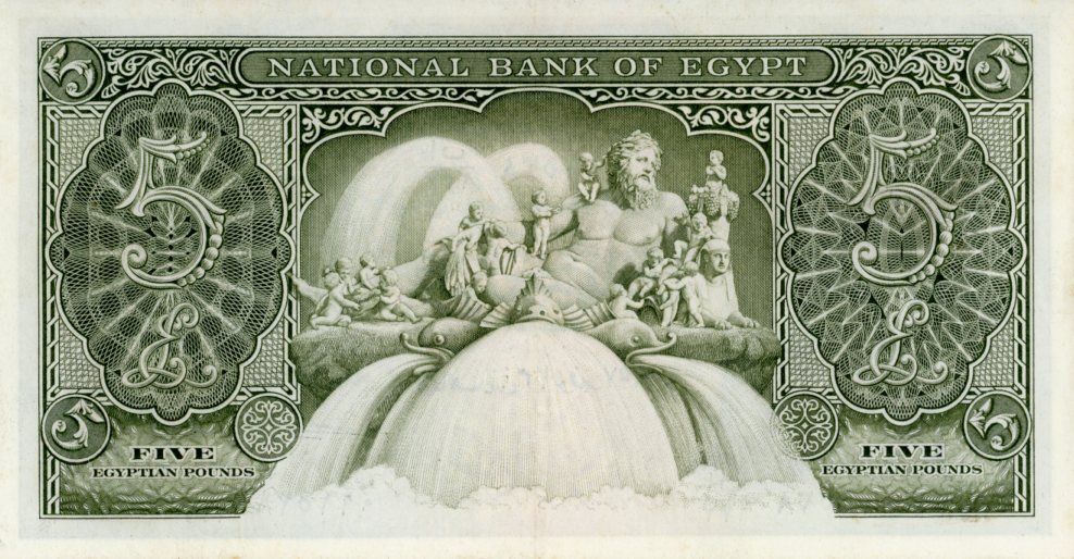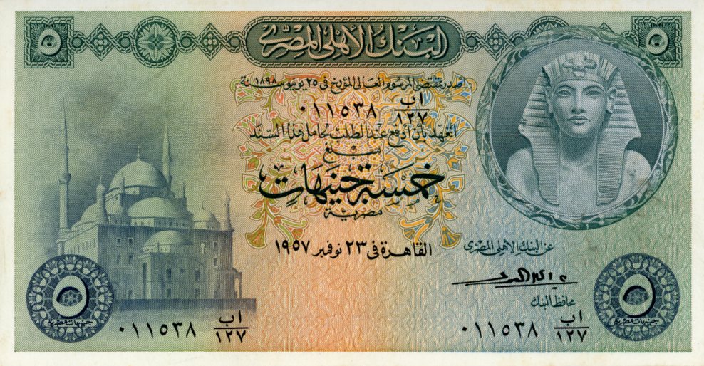 Notes: This is the second issue of this note, with Tutankhamun on the front. The first issue, used from 1946-1951, showed King Farouk on the front but was otherwise similar (Pick 25). The front depicts the Citadel of Cairo and the rear depicts the source of the Nile. The watermark is a flower.