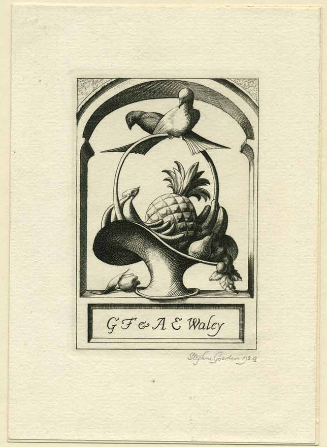 Gooden's designs for bookplates issued before 1944 are reproduced in the book by Campbell Dodgson (1944) An Iconography of the Engravings of Stephen Gooden. London: Elkin Matthews.